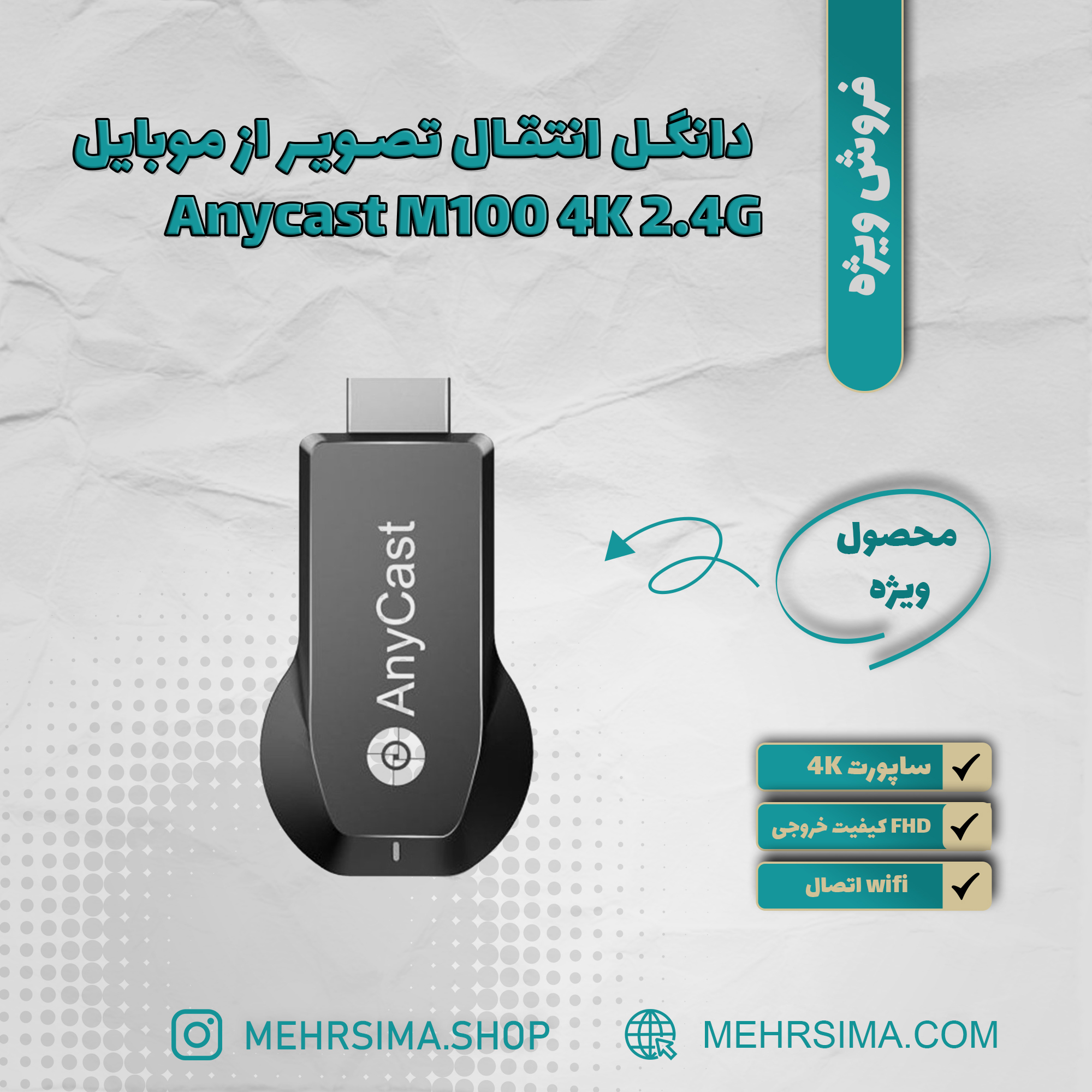 دانگل Anycast M100 4K محصول جدید انی کست از خانواده دانگل HDMI و انتقال تصویر موبایل به تلویزیون می باشد که در سال 2018 تولید و به بازار عرضه شد. دانگل Anycast M100 4K همانطور که از اسمش پیداست قابلت پخش تصاویر با رزولوشن 4K@30Hz را دارد. این قابلیت بواسطه سخت افزاری است که برای این محصول در نظر گرفته شده. استفاده از پردازنده نسل جدید AM8272 و رم 256 مگابایتی DDR3 قدرت و سرعت بالاتری نسبت به محصولات نسل قبل خود مانند Anycast M4 Plus دارد. اما در شبکه WiFi تغییر خاصی انجام نشده و دانگل انی کست M100 از یک شبکه وای فای ساده 2.4 گیگاهرتزی 802.11ac 2.4G بهره می برد.